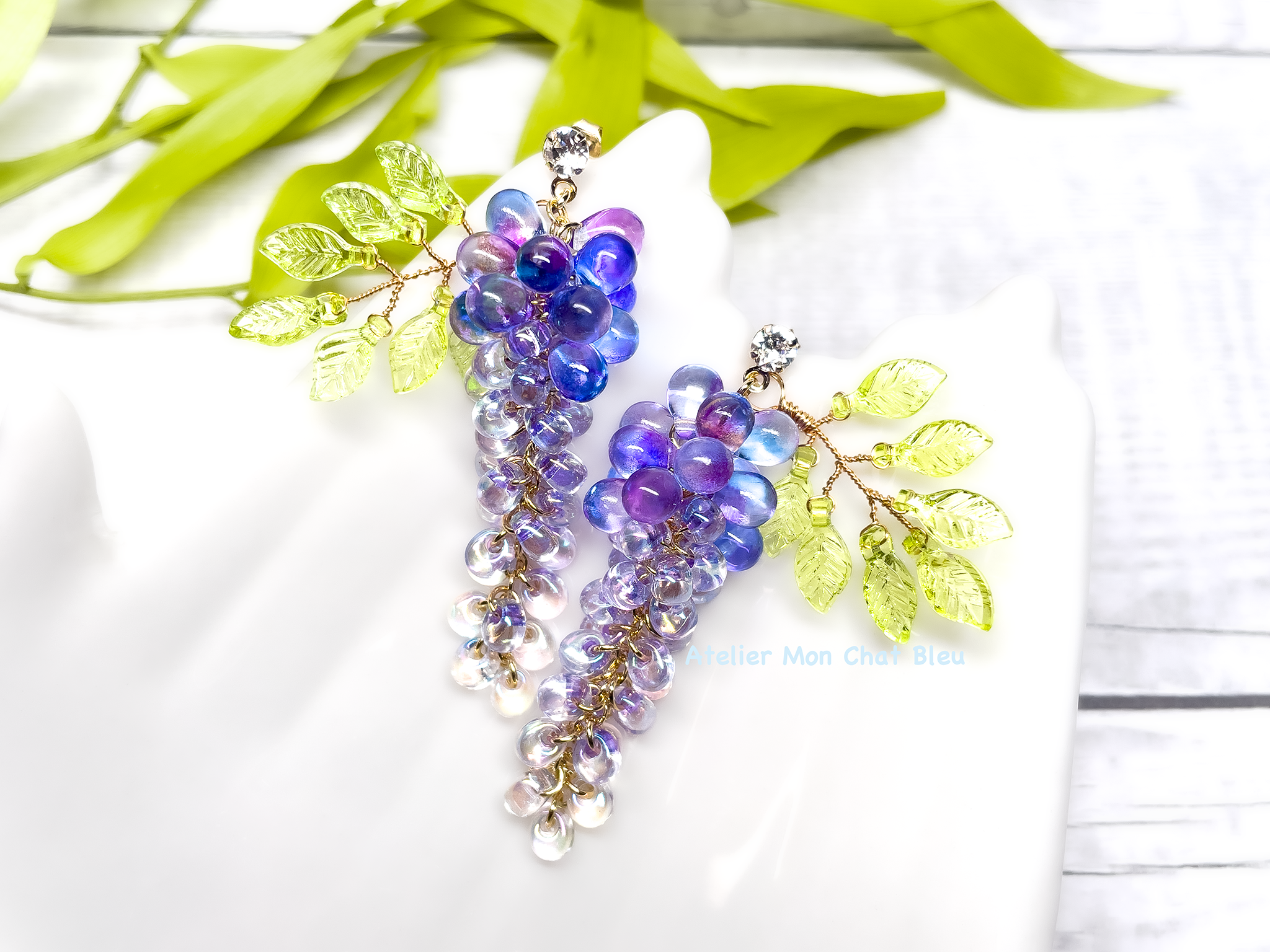 ワイヤーで作ったリーフが、藤の紫をより一層引き立てます。