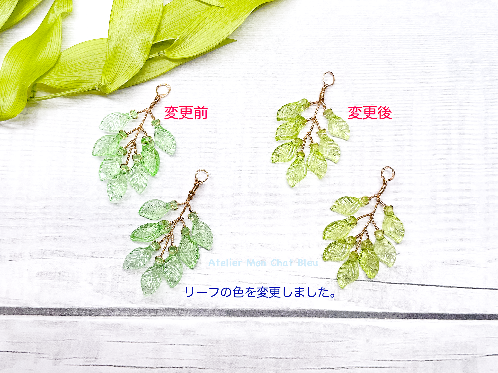 この度、リーフのビーズの色が、黄味のあるグリーンに変更となりました。